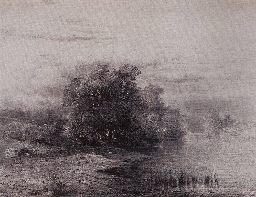 Ti offriamo una riproduzione artigianale su tela dell'opera famosa 'Alberi dal fiume' di Aleksey Savrasov, dal Museo delle Riproduzioni.