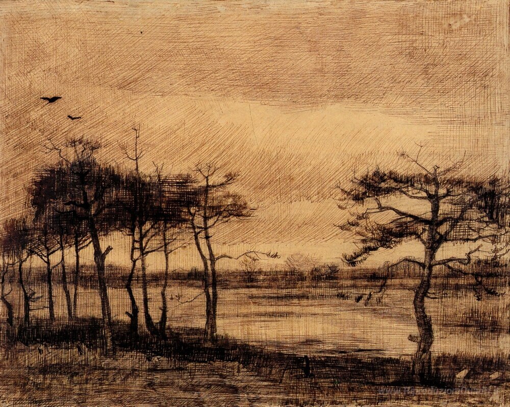 Ti offriamo una riproduzione artigianale su tela dell'opera famosa 'Alberi di pino in Maremma' di Vincent van Gogh, dal Museo delle Riproduzioni.