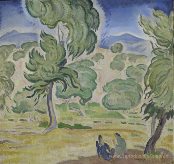 Ti offriamo una riproduzione artigianale su tela dell'opera famosa 'Alberi di pino su Kerkyra' di Konstantinos Parthenis, dal Museo delle Riproduzioni.