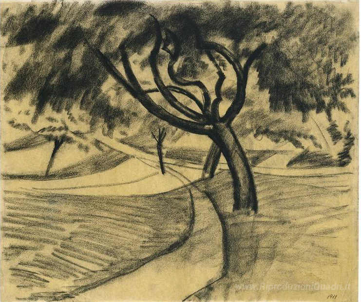 Ti offriamo una riproduzione artigianale su tela dell'opera famosa 'Alberi e campi' di August Macke, dal Museo delle Riproduzioni.
