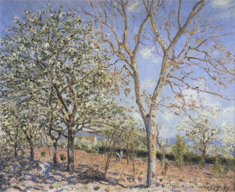 Ti offriamo una riproduzione artigianale su tela dell'opera famosa 'Alberi in fiore' di Alfred Sisley, dal Museo delle Riproduzioni.