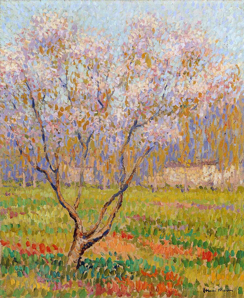 Ti offriamo una riproduzione artigianale su tela dell'opera famosa 'Alberi in fiore' di Henri Martin, dal Museo delle Riproduzioni.