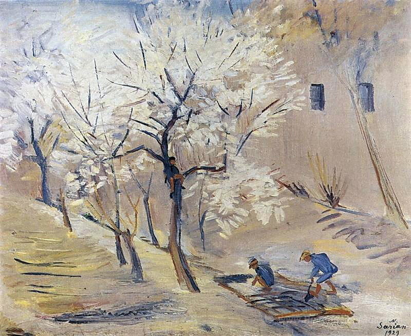 Ti offriamo una riproduzione artigianale su tela dell'opera famosa 'Albicocchi in fiore' di Martiros Saryan, dal Museo delle Riproduzioni.