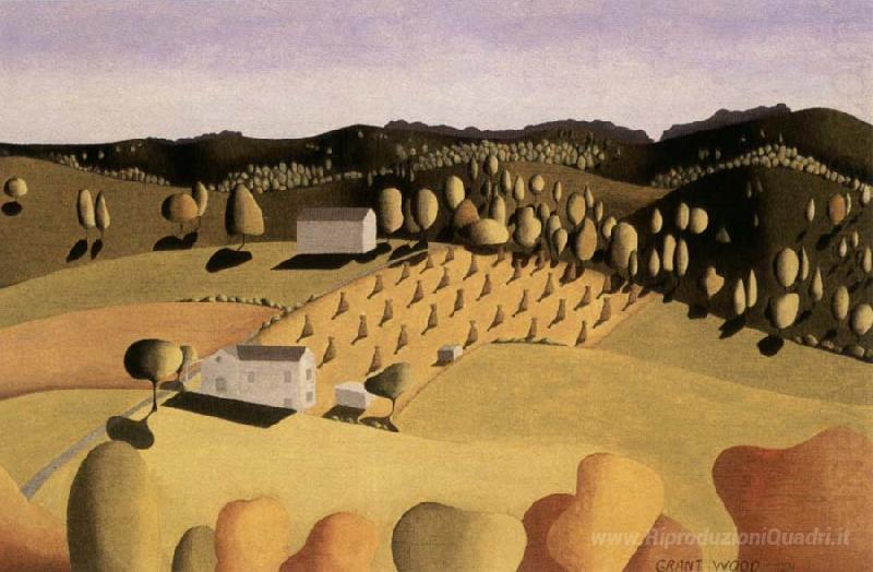 Ti offriamo una riproduzione artigianale su tela dell'opera famosa 'Alcuni di mais' di Grant Wood, dal Museo delle Riproduzioni.