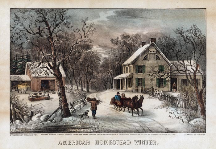 Ti offriamo una riproduzione artigianale su tela dell'opera famosa 'Americana Homestead Inverno' di Currier and Ives, dal Museo delle Riproduzioni.