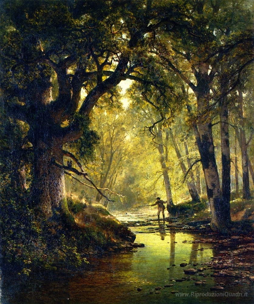 Ti offriamo una riproduzione artigianale su tela dell'opera famosa 'Angler in un interno della foresta' di Thomas Hill, dal Museo delle Riproduzioni.