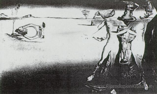 Ti offriamo una riproduzione artigianale su tela dell'opera famosa 'Apparizione di una coppia nel deserto' di Salvador Dali, dal Museo delle Riproduzioni.
