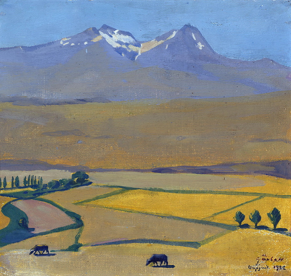 Ti offriamo una riproduzione artigianale su tela dell'opera famosa 'Aragats in estate' di Martiros Saryan, dal Museo delle Riproduzioni.