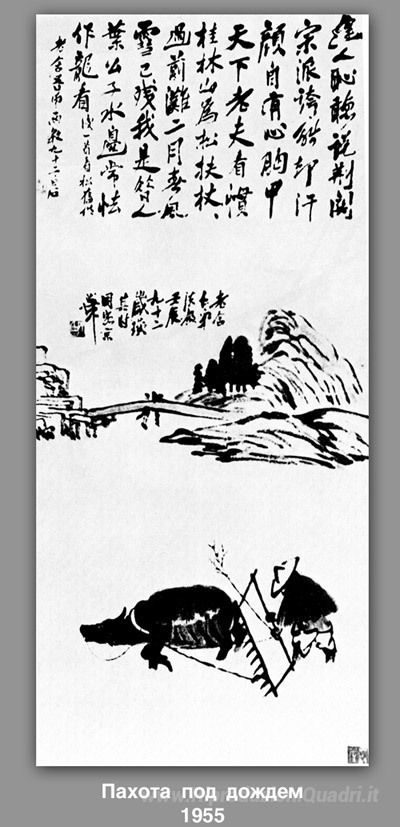 Ti offriamo una riproduzione artigianale su tela dell'opera famosa 'Arando sotto la pioggia' di Qi Baishi, dal Museo delle Riproduzioni.
