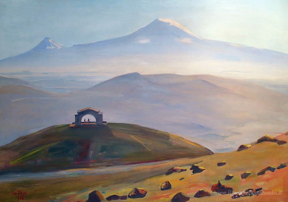 Ti offriamo una riproduzione artigianale su tela dell'opera famosa 'Ararat e arco Charents' di Martiros Saryan, dal Museo delle Riproduzioni.