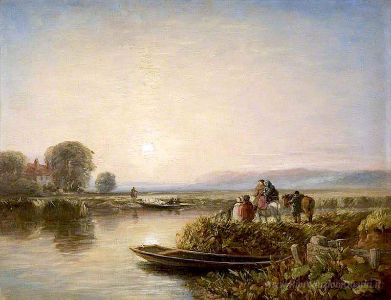 Ti offriamo una riproduzione artigianale su tela dell'opera famosa 'Aspettando il traghetto, Mattina' di David Cox, dal Museo delle Riproduzioni.