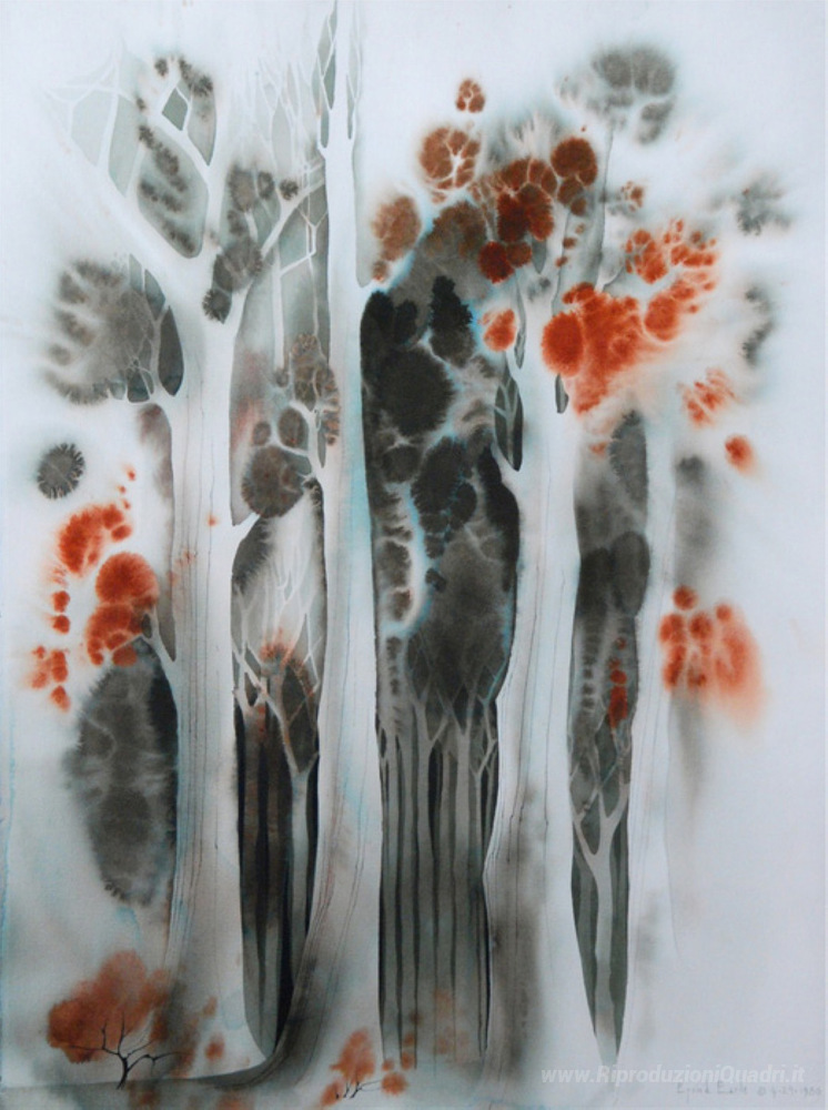Ti offriamo una riproduzione artigianale su tela dell'opera famosa 'Autumn Forest' di Eyvind Earle, dal Museo delle Riproduzioni.