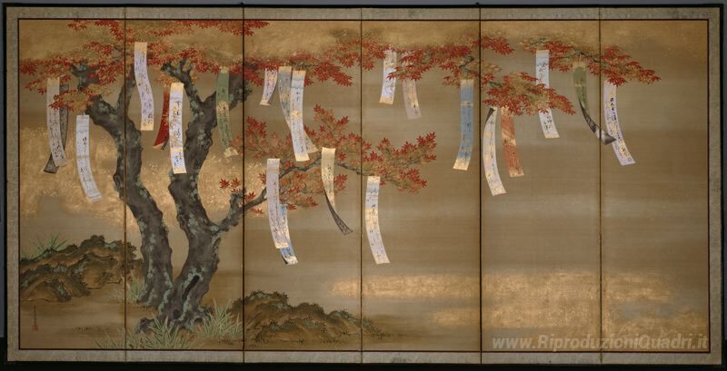 Ti offriamo una riproduzione artigianale su tela dell'opera famosa 'Autunno Aceri con Poem Slips' di Tosa Mitsuoki, dal Museo delle Riproduzioni.
