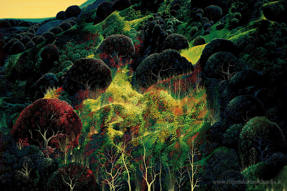 Ti offriamo una riproduzione artigianale su tela dell'opera famosa 'Autunno Campi' di Eyvind Earle, dal Museo delle Riproduzioni.