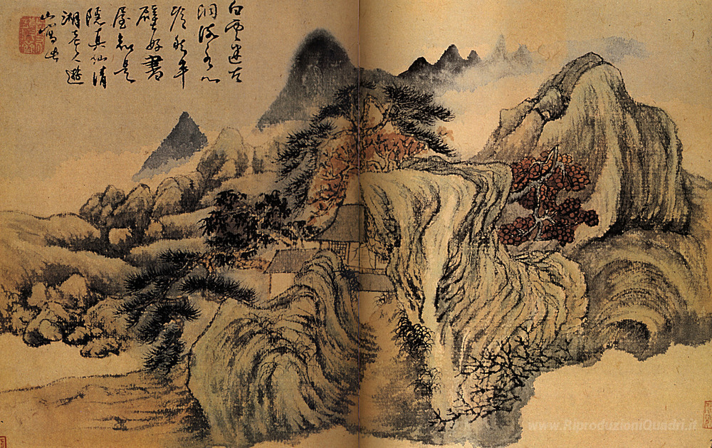 Ti offriamo una riproduzione artigianale su tela dell'opera famosa 'Autunno montagna' di Shitao, dal Museo delle Riproduzioni.
