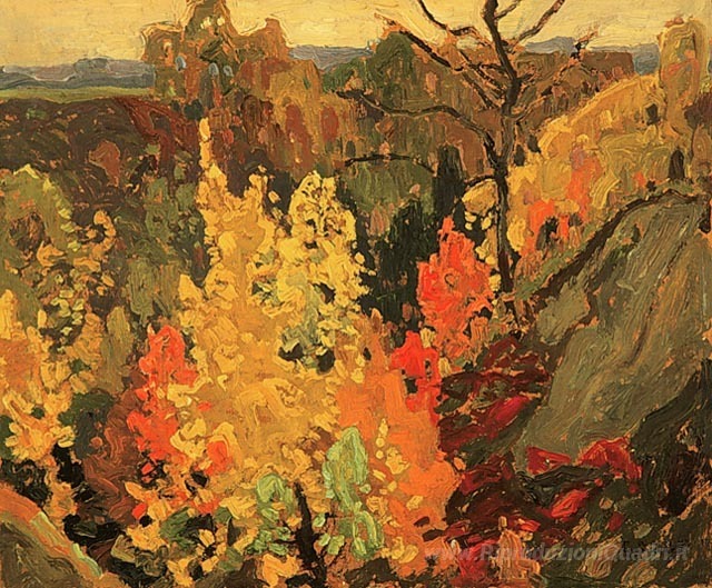 Ti offriamo una riproduzione artigianale su tela dell'opera famosa 'Autunno' di Franklin Carmichael, dal Museo delle Riproduzioni.
