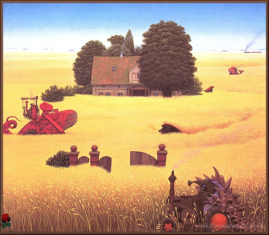 Ti offriamo una riproduzione artigianale su tela dell'opera famosa 'Avventura in vacanza' di Jacek Yerka, dal Museo delle Riproduzioni.