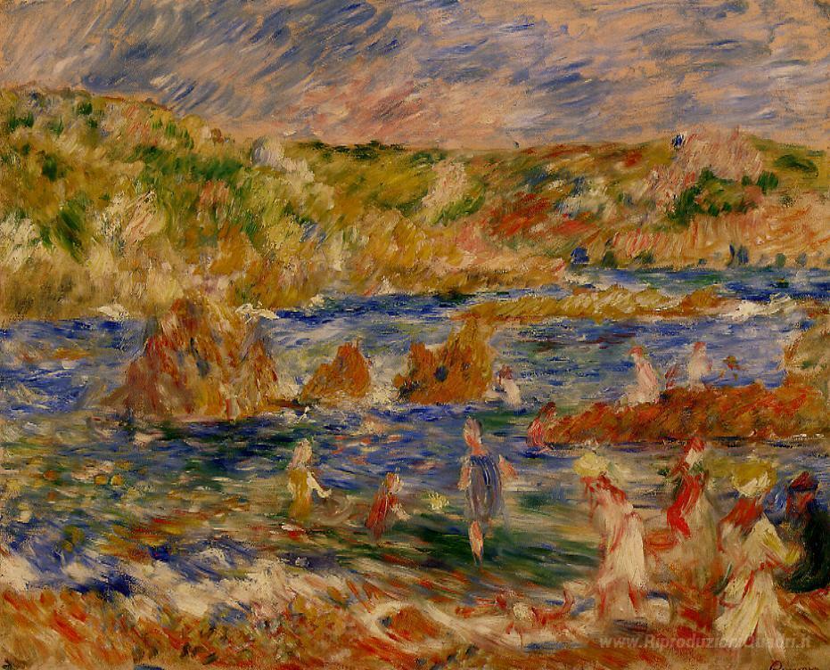 Scopri Bambini sulla spiaggia a Guernsey, un capolavoro senza tempo del celebre artista francese Pierre-Auguste Renoir, maestro del movimento impressionista. L'opera, realizzata con l'uso di vivaci colori ad olio, cattura la spensieratezza dell'infanzia in uno scenario idilliaco, dove la luce del sole danza sulle onde del mare e i piccoli protagonisti giocano, immersi nella gioia estiva. Renoir, noto per la sua sensibilità nell'affrontare la figura umana e la natura, riesce a trasmettere una vitalità unica attraverso la sua tecnica di pennellate rapide e fluidi contrasti cromatici.