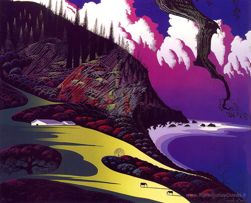 Ti offriamo una riproduzione artigianale su tela dell'opera famosa 'Barns By the Sea' di Eyvind Earle, dal Museo delle Riproduzioni.