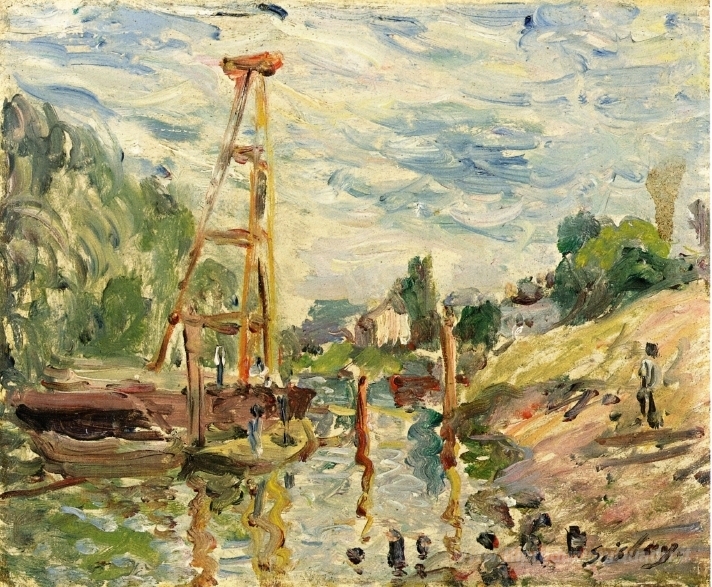 Ti offriamo una riproduzione artigianale su tela dell'opera famosa 'Bateau de Charge sur le Loing' di Alfred Sisley, dal Museo delle Riproduzioni.