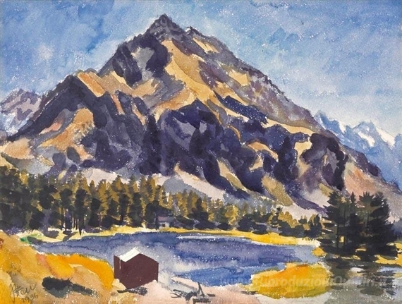 Ti offriamo una riproduzione artigianale su tela dell'opera famosa 'Bergsee (Un lago di montagna)' di Johannes Itten, dal Museo delle Riproduzioni.
