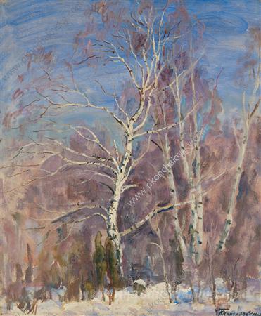 Ti offriamo una riproduzione artigianale su tela dell'opera famosa 'Betulle nella neve' di Pyotr Konchalovsky, dal Museo delle Riproduzioni.