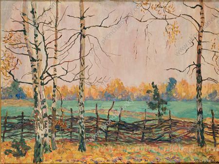 Ti offriamo una riproduzione artigianale su tela dell'opera famosa 'Betulle per la recinzione' di Pyotr Konchalovsky, dal Museo delle Riproduzioni.