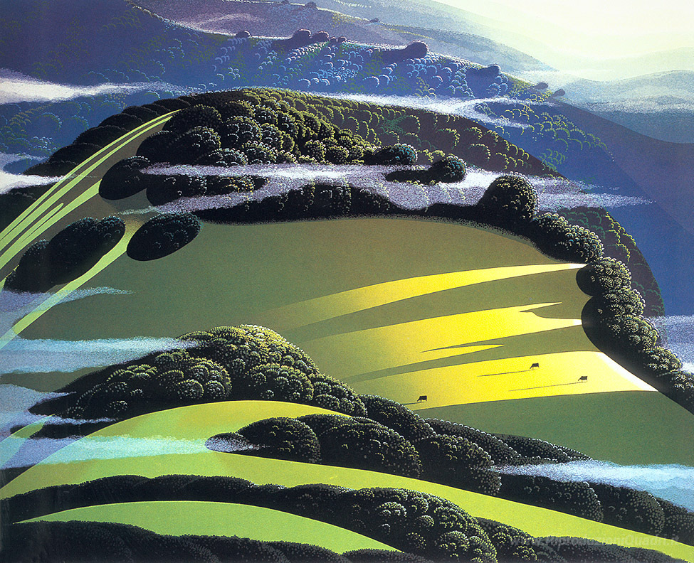 Ti offriamo una riproduzione artigianale su tela dell'opera famosa 'Beyond the Valley' di Eyvind Earle, dal Museo delle Riproduzioni.