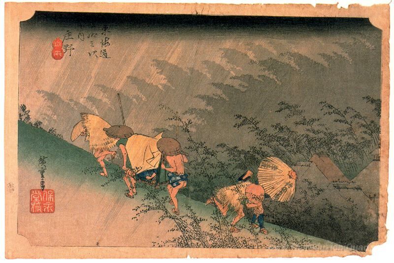 Ti offriamo una riproduzione artigianale su tela dell'opera famosa 'Bianco Pioggia, Shono' di Hiroshige, dal Museo delle Riproduzioni.