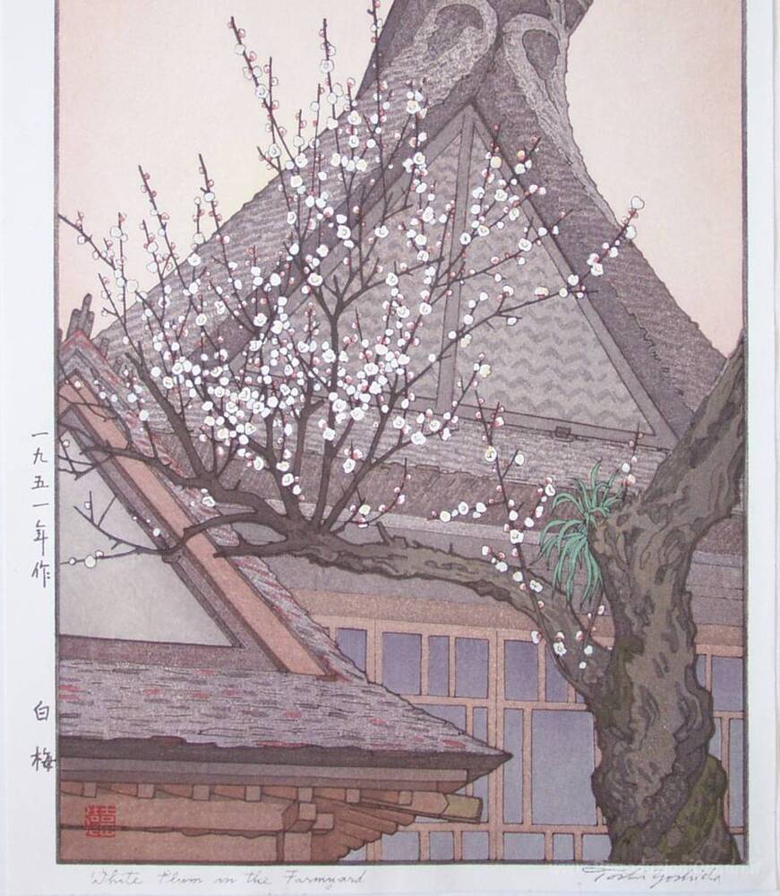 Ti offriamo una riproduzione artigianale su tela dell'opera famosa 'Bianco Plum nell'aia' di Toshi Yoshida, dal Museo delle Riproduzioni.