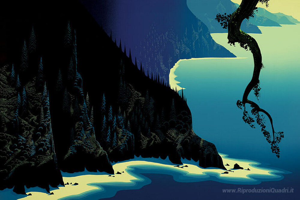 Ti offriamo una riproduzione artigianale su tela dell'opera famosa 'Big Sur' di Eyvind Earle, dal Museo delle Riproduzioni.