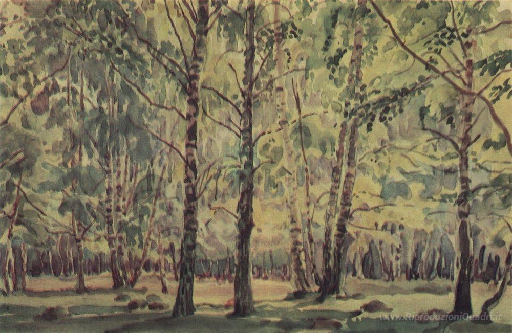 Ti offriamo una riproduzione artigianale su tela dell'opera famosa 'Birch Grove' di Konstantin Bogaevsky, dal Museo delle Riproduzioni.