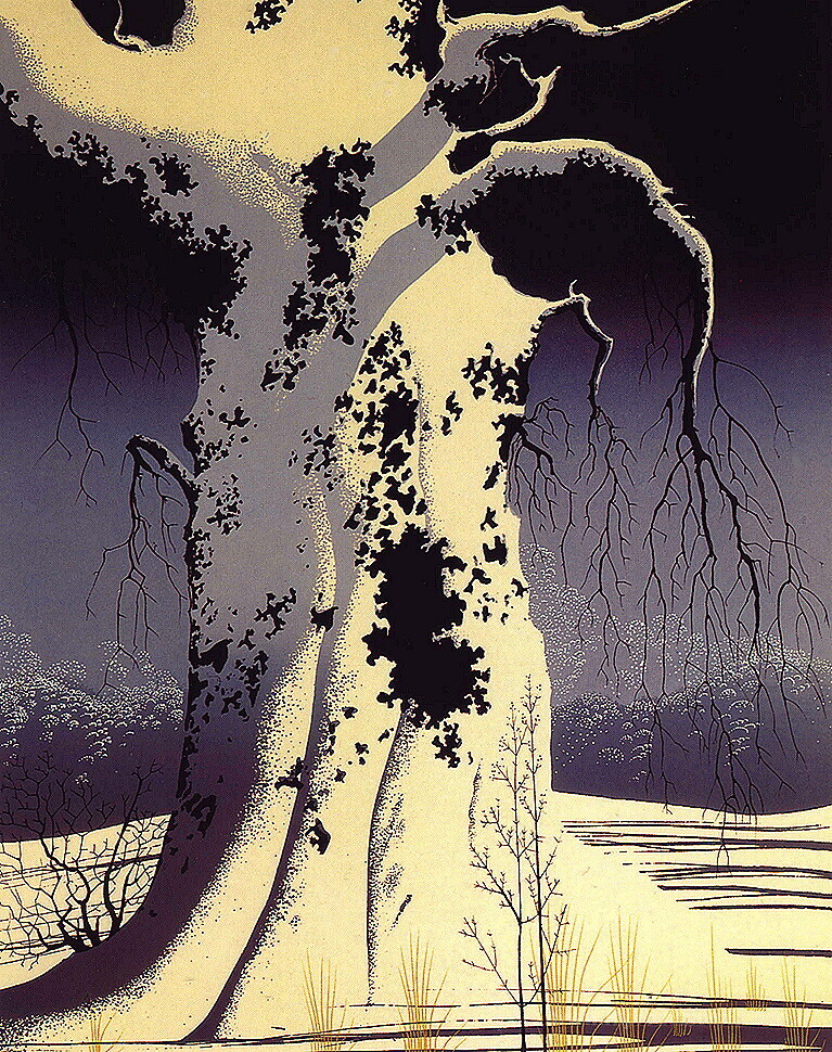Ti offriamo una riproduzione artigianale su tela dell'opera famosa 'Black Oak' di Eyvind Earle, dal Museo delle Riproduzioni.