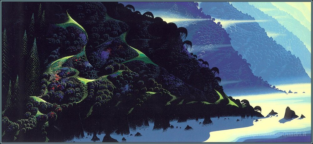 Ti offriamo una riproduzione artigianale su tela dell'opera famosa 'Blu Costa' di Eyvind Earle, dal Museo delle Riproduzioni.