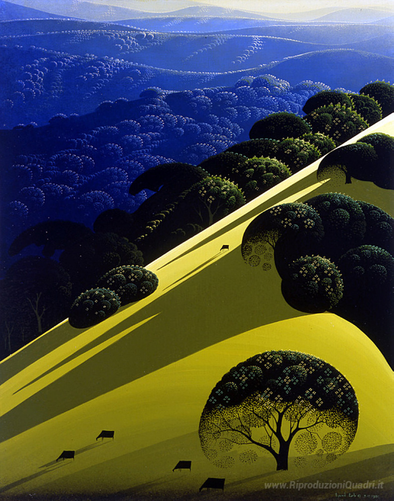 Ti offriamo una riproduzione artigianale su tela dell'opera famosa 'Blue Mountain Campi' di Eyvind Earle, dal Museo delle Riproduzioni.