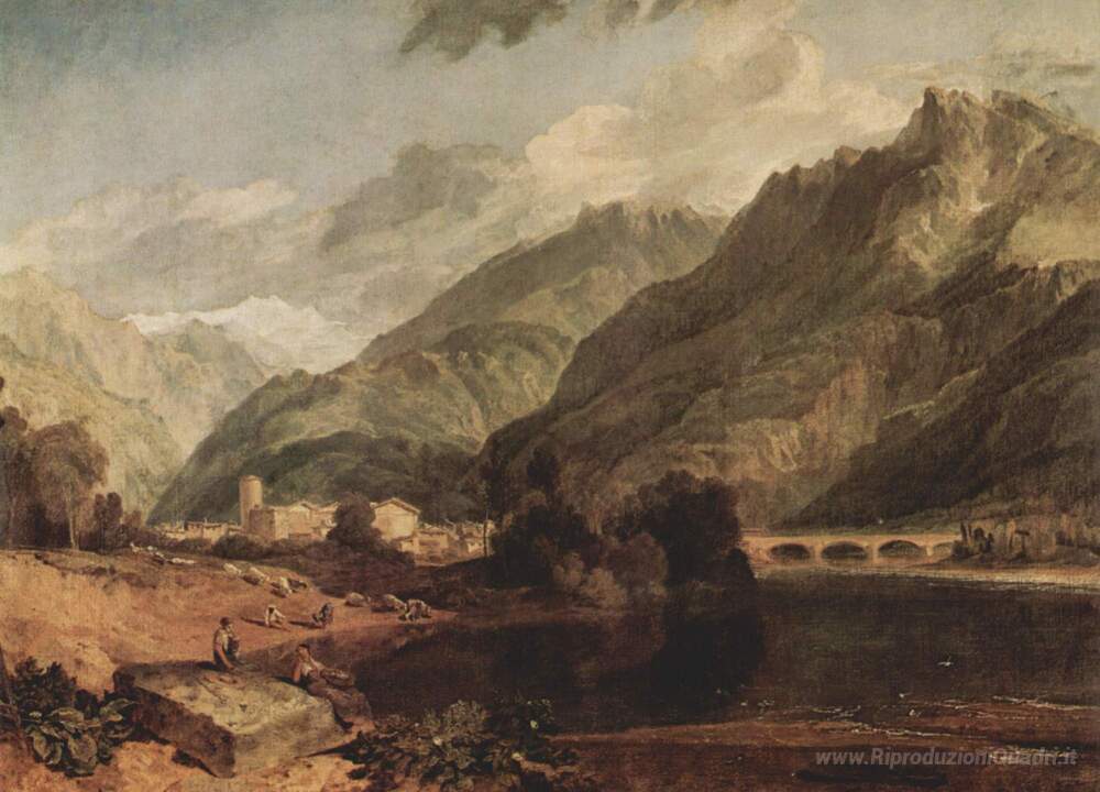 Ti offriamo una riproduzione artigianale su tela dell'opera famosa 'Bonneville, Savoia con il Monte Bianco' di William Turner, dal Museo delle Riproduzioni.