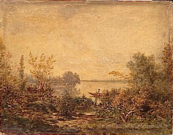 Ti offriamo una riproduzione artigianale su tela dell'opera famosa 'Bordo di fiume' di Theodore Rousseau, dal Museo delle Riproduzioni.