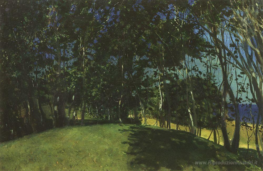 Ti offriamo una riproduzione artigianale su tela dell'opera famosa 'Boschetto in riva al mare. Sillamyagi' di Konstantin Somov, dal Museo delle Riproduzioni.