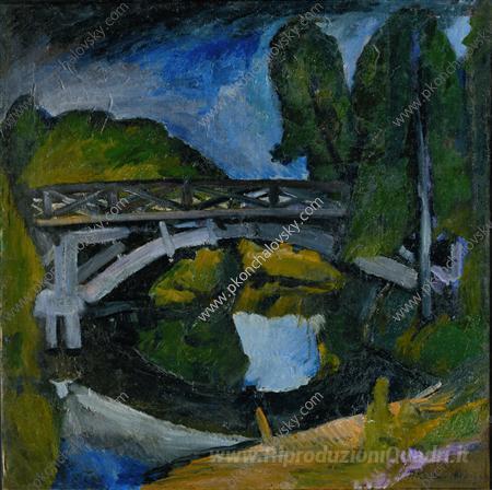 Ti offriamo una riproduzione artigianale su tela dell'opera famosa 'Bridge in Abramtsevo' di Pyotr Konchalovsky, dal Museo delle Riproduzioni.