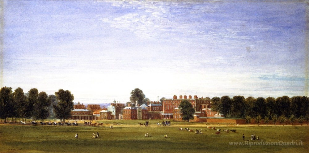 Ti offriamo una riproduzione artigianale su tela dell'opera famosa 'Buckingham House dal Parco Verde' di David Cox, dal Museo delle Riproduzioni.