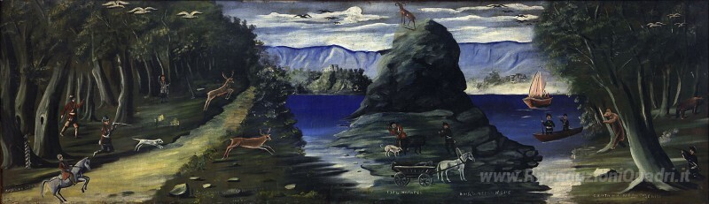 Ti offriamo una riproduzione artigianale su tela dell'opera famosa 'Caccia Scena con una vista del Mar Nero' di Niko Pirosmani, dal Museo delle Riproduzioni.