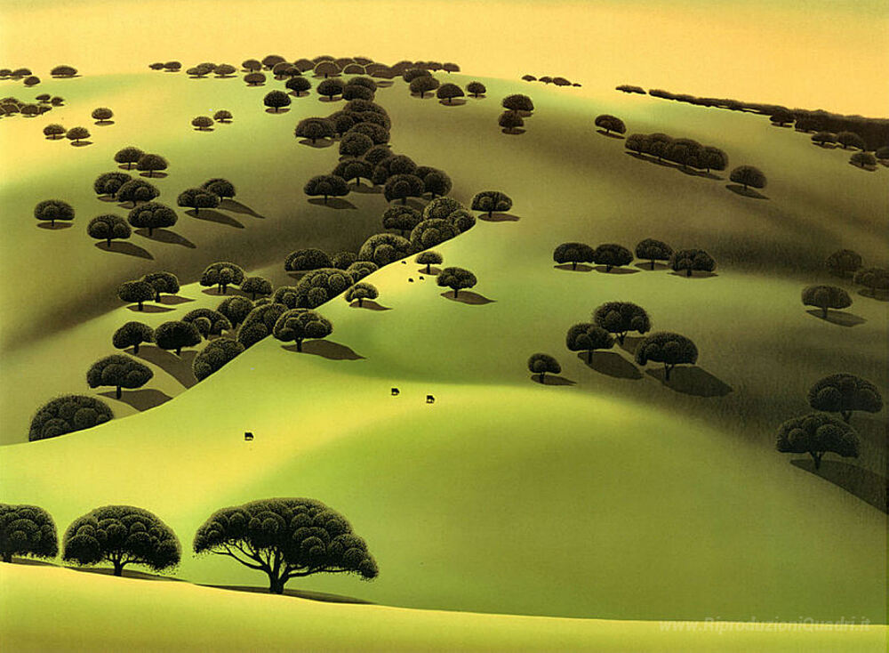 Ti offriamo una riproduzione artigianale su tela dell'opera famosa 'Cachuma Ranch' di Eyvind Earle, dal Museo delle Riproduzioni.
