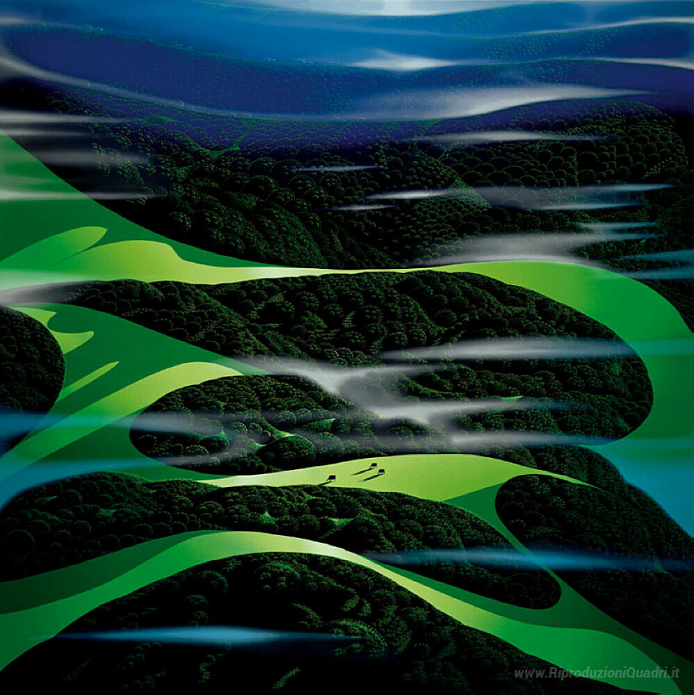 Ti offriamo una riproduzione artigianale su tela dell'opera famosa 'Campi verdi' di Eyvind Earle, dal Museo delle Riproduzioni.