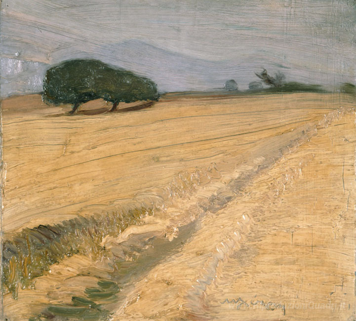 Ti offriamo una riproduzione artigianale su tela dell'opera famosa 'Campo con mucchi di fieno' di Nikolaos Lytras, dal Museo delle Riproduzioni.