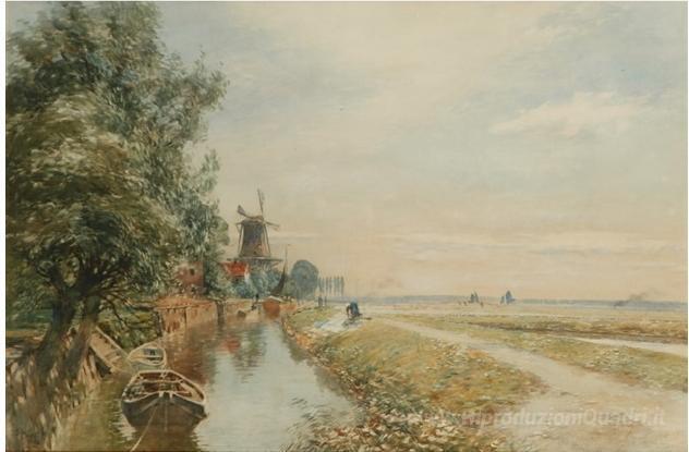 Ti offriamo una riproduzione artigianale su tela dell'opera famosa 'Canal scene con windmil' di Tom Scott, dal Museo delle Riproduzioni.