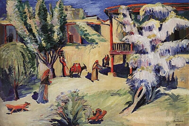 Ti offriamo una riproduzione artigianale su tela dell'opera famosa 'Cantiere a Yerevan' di Martiros Saryan, dal Museo delle Riproduzioni.