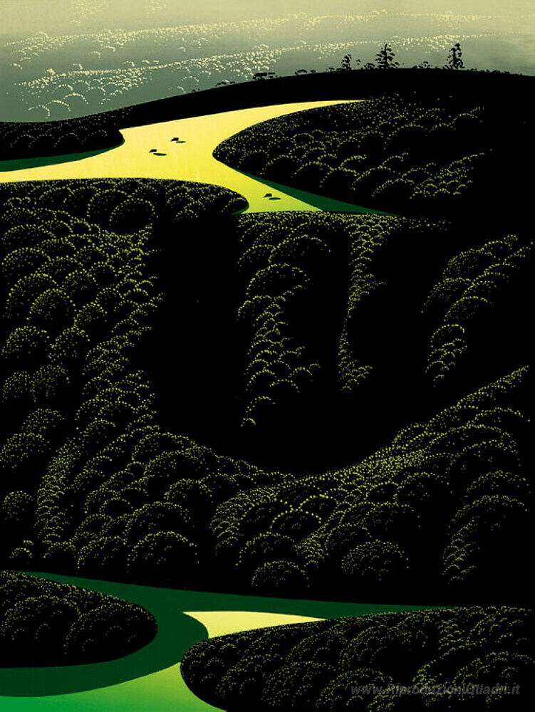 Ti offriamo una riproduzione artigianale su tela dell'opera famosa 'Carmel Valley Canyon' di Eyvind Earle, dal Museo delle Riproduzioni.