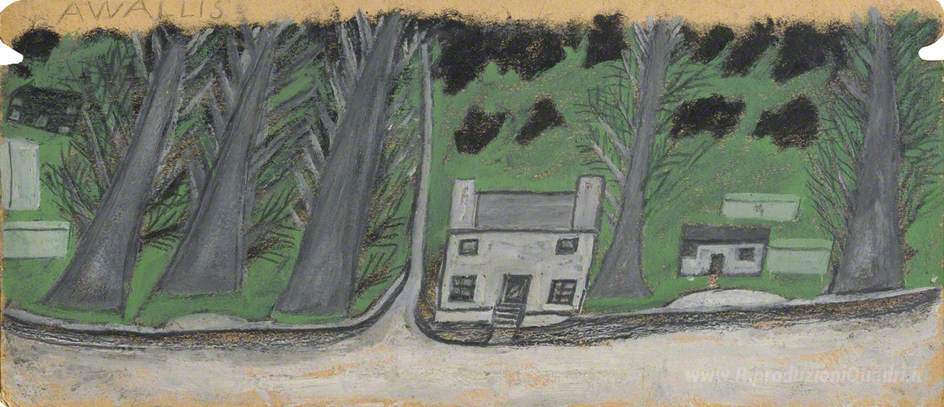Ti offriamo una riproduzione artigianale su tela dell'opera famosa 'Casa con alberi' di Alfred Wallis, dal Museo delle Riproduzioni.