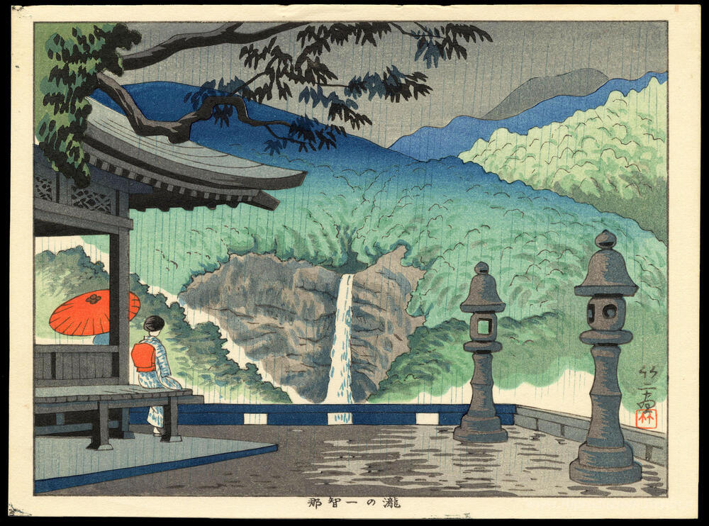 Ti offriamo una riproduzione artigianale su tela dell'opera famosa 'Cascata Nachi' di Asano Takeji, dal Museo delle Riproduzioni.