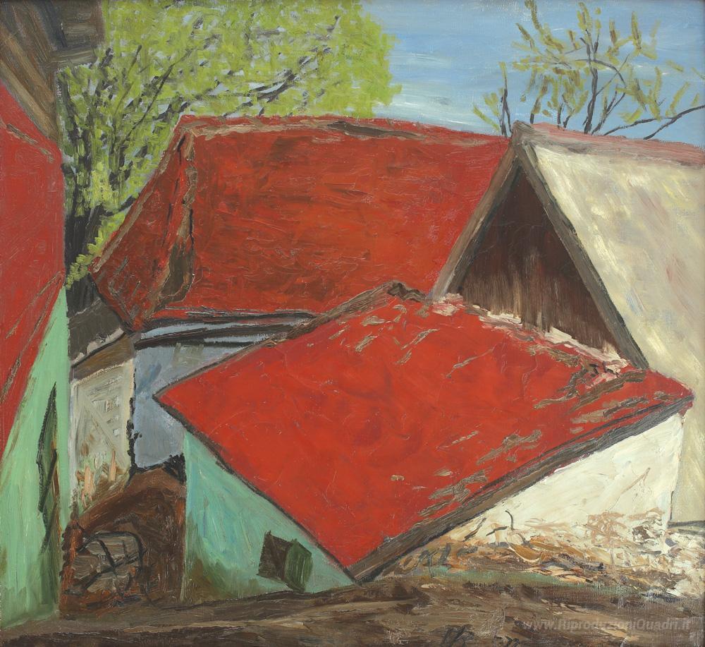 Ti offriamo una riproduzione artigianale su tela dell'opera famosa 'Case a Poiana M?rului' di Horia Bernea, dal Museo delle Riproduzioni.